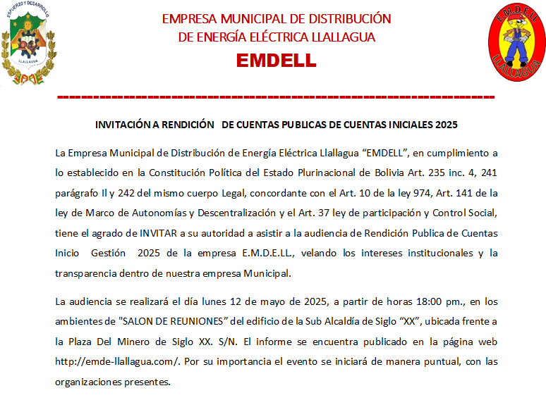 Empresa Municipal de Distribución de Energía Eléctrica Llallagua “EMDELL”, Creada con resolucion Municipal 181/2018 del 22 de noviembre del 2018, y Autorizada por Resolucion AETN N° 491/2020 del 30 de noviembre de 2020